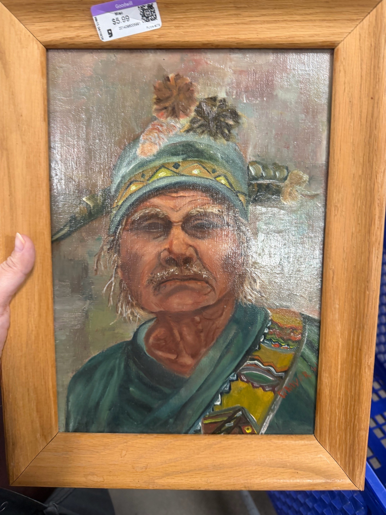 This is an original representational oil or acrylic painting on canvas board, depicting a portrait of a Native American man. The figure is rendered with heavy impasto and visible brushwork, emphasizing the aged, weathered texture of his skin and the specific details of his regalia. He is shown wearing a teal-colored headpiece adorned with feathers and pom-poms, a patterned yellow band, and a matching teal garment with a colorful geometric embroidered sash. The color palette is dominated by earthy tones, muted greens, and ochres, set against a loosely rendered, neutral background. The piece is signed 'Grover' in red paint in the lower right corner, likely by a regional or amateur artist active in the late 20th century. The artwork is housed in a simple, honey-toned rectangular wooden frame with mitered corners. While the painting surface appears generally stable, there is a visible sheen indicating a gloss varnish. The framing is functional but basic, typical of decor items or student work. Given the style and materials, it likely dates from the 1970s to the 1990s. The presence of a thrift store price tag ($5.99) on the top frame rail suggests it has secondary market history in a charitable retail environment. The craftsmanship shows a focus on character and ethnic identity, utilizing layered paint to create a sense of depth and three-dimensionality in the subject's face.