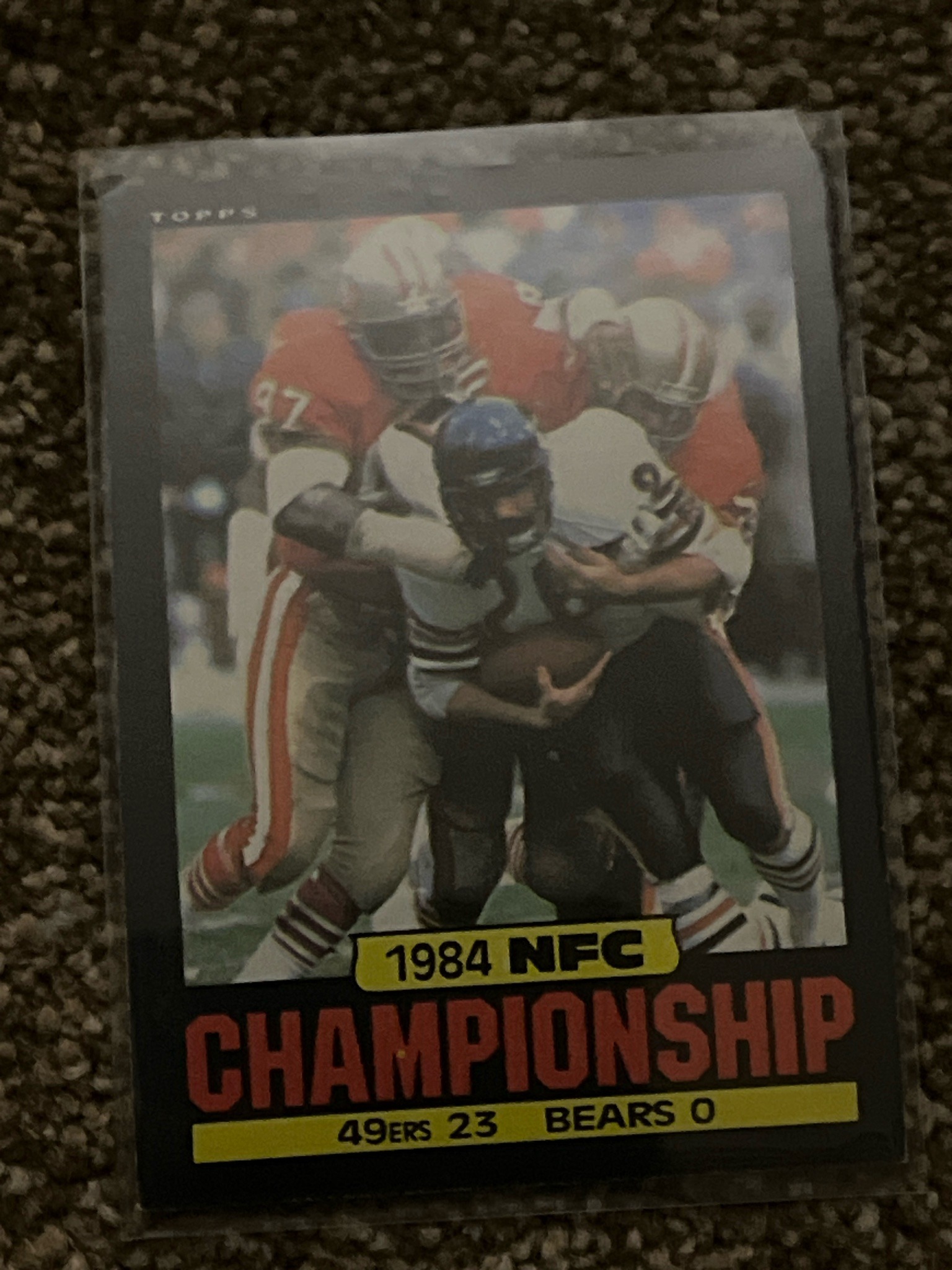 This is a vintage 1985 Topps football trading card commemorating the 1984 NFC Championship game between the San Francisco 49ers and the Chicago Bears. The card features a vertical orientation with a black border, a design hallmark of the 1985 Topps football set. The front imagery displays an action shot of a Chicago Bears player being tackled by multiple 49ers defenders, including one wearing jersey number 97. At the top left, the 'TOPPS' brand logo is subtly printed in white. The bottom of the card contains bold graphic text elements: '1984 NFC' in a yellow pill-shaped box, 'CHAMPIONSHIP' in large orange block letters, and a final yellow bar indicating the score '49ERS 23 BEARS 0'. Physically, the card is standard size (2.5 by 3.5 inches) and is currently stored in a protective soft plastic sleeve. Observed condition issues through the sleeve include slight corner softening and potential surface scratches on the plastic, though the card's centering appears reasonably balanced within the thick black borders. This specific card design is notable among collectors for the fragility of its black edges, which easily show whitening or 'chipping' from wear. The card reflects 1980s printing technology on typical cardboard stock and serves as a historical record of the 49ers' dominant 1984 season.