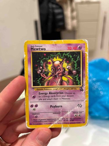 This is a standard-sized collectible trading card featuring the 'Genetic Pokémon' Mewtwo. The card is a 1999-2000 Wizards of the Coast Black Star Promo, specifically designated as card number 3, which was originally released through the Pokémon: The First Movie theatrical promotion. The card features Ken Sugimori's iconic artwork depicting Mewtwo with its arms outstretched against a dark, cosmic background. It is identifiable as a promotional card by the black star 'PROMO' stamp located just below the artwork on the right side. The card face has a purple psychic-type border and lists 'Energy Absorption' and 'Psyburn' as its moves. Regarding condition, the card is in 'Damaged' or 'Poor' state. There is a prominent vertical crease running through the center of the card, along with significant edge wear (whitening) and corner fraying. The bottom right corner shows heavy creasing and structural integrity loss. Numerous surface scratches and scuffs are visible across both the holographic-effect text areas and the yellow borders, suggesting it was heavily played or stored without protection. Despite the severe wear, the core identifiers, including copyright dates (1995, 96, 98 Nintendo/Creatures/GAMEFREAK) and set numbering, remain legible.