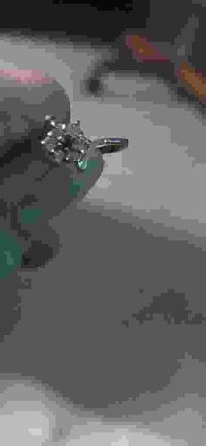 This item is an elegant ring, likely an engagement or eternity ring, featuring a floral or snowflake-style cluster design. The primary focal point is a central round-cut stone, possibly a diamond or high-quality cubic zirconia, surrounded by six smaller round-cut accent stones. The metal appears to be a polished white metal, such as sterling silver, white gold, or platinum, based on its bright, reflective sheen. The stones are secured using traditional prong settings, which elevate the cluster to catch maximum light. The band is a slender, bypass or slightly tapered style that curves elegantly toward the center setting, providing a modern yet classic aesthetic. In terms of condition, the metal shows a high-polish finish with no immediate signs of heavy tarnishing or deep scratches visible in this resolution, though some natural wear or light surface micro-abrasions are common for such pieces. There are no visible maker's marks or hallmarks on the exterior of the band, though they would likely be stamped inside the shank. This style is consistent with late 20th-century to contemporary jewelry design. The craftsmanship appears precise, with symmetrical prong placement suggesting a quality manufacturing process either by cast or hand-finishing.