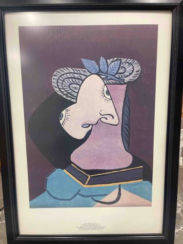This item is a framed limited edition lithographic print of Pablo Picasso's 'Femme au Chapeau' (Woman in a Hat), originally painted in 1939. The artwork features a classic cubist portrait of a woman, characterized by distorted facial features, bold black outlines, and a distinct palette of muted purples, pale pinks, and soft blues. The subject wears an ornate grey and white patterned hat adorned with blue leaves. The print is housed behind glass in a decorative black wooden frame with a 'rope' or 'beaded' relief pattern on the inner edge. According to the user context provided, this specific print is numbered 398 out of a limited edition of 5000. Text is visible at the bottom center margin, likely providing the title, copyright information, and publication details consistent with high-quality estate-approved or museum editions. The composition utilizes a flat, graphic style typical of Picasso's later cubist experiments. The condition appears to be excellent, as it is professionally matted and framed, showing no visible signs of foxing, fading, or moisture damage to the paper. The frame itself shows minor dust but no significant chips or structural damage. This piece represents a high-volume decorative art edition, often produced to make iconic works accessible to private collectors.