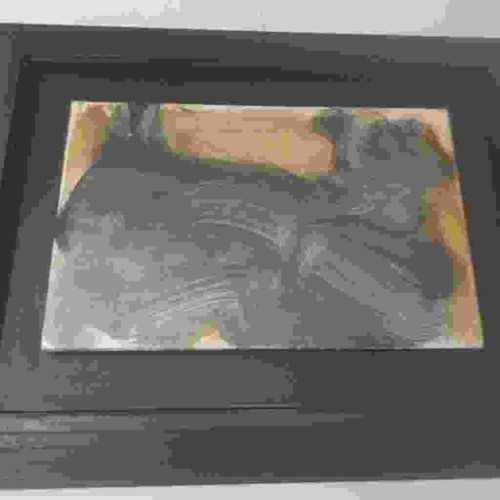 This item is an original abstract painting, possibly a mixed media work involving acrylics or charcoal, presented in a contemporary black wooden frame. The artwork features a heavy, textured application of medium with a color palette dominated by slate grays, charcoal, and ochre-toned beige. The composition is highly expressive, utilizing broad, gestural brushstrokes or impasto techniques that create a sense of depth and movement through varying levels of opacity and metallic-like light reflection. The central motif appears non-representational, focusing on the interplay of line and shadow within a rectangular format. The frame is a deep-set, modern gallery-style profile with a matte black finish, likely constructed from kiln-dried wood. The artwork is mounted behind glass with a visible white border, suggesting a matted presentation that provides a visual buffer from the frame edge. In terms of condition, the frame appears to have minor surface dust and potential light scuffing on the top edge, though the artwork itself seems well-protected. The age appears to be contemporary (late 20th or 21st century) based on the framing style and abstract vernacular. No discernible artist signature or maker's marks are visible in the low-resolution image, but the craftsmanship of the framing and the intentionality of the gestural strokes suggest a professional studio piece.