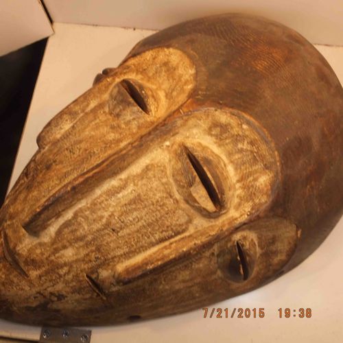 This is a hand-carved wooden mask, evocative of West African tribal art traditions, specifically bearing stylistic similarities to the Fang or Ogoni people. The mask features an elongated, ovoid facial structure with a prominent, high forehead and a tapered chin. The facial features are highly stylized, characterized by narrow, slit-like eyes set within large, lighter-pigmented concave eye sockets. A long, thin, straight nose bridges the face, leading down to a small, horizontal slit representing the mouth. The mask is carved from a single block of dense hardwood and exhibits a two-toned finish: a dark, reddish-brown patina on the upper crown and perimeter, contrasting with a lighter, buff-colored textured surface on the main facial plane. Visible chisel marks and hand-tooling across the surface indicate traditional craftsmanship rather than industrial production. Condition-wise, the piece shows significant signs of age and handling, including surface abrasions, small nicks along the edges, and a naturally aged patina with some accumulation of dust in the recessed areas. There are no visible maker's marks or signatures, which is common for ethnographic-style ritual or decorative objects. The overall aesthetic suggests a 20th-century creation intended for the decorative or 'airport art' market, though it maintains a high level of expressive sculptural quality.