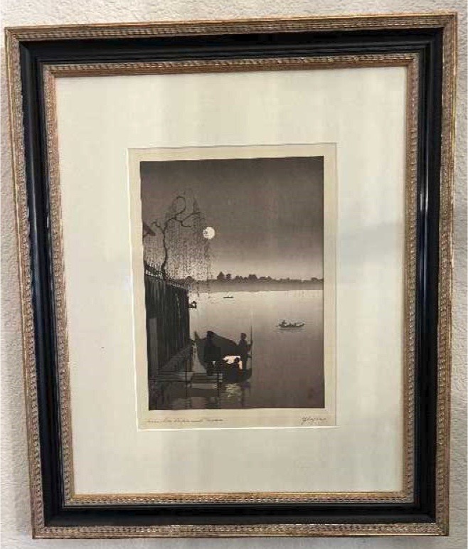 This is a Japanese woodblock print (ukiyo-e/shin-hanga) by the renowned artist Kobayashi Kiyochika (1847–1915), likely part of his influential series depicting Tokyo landscapes at night. The work showcases Kiyochika’s signature mastery of 'mousen' (light and shadow), blending traditional Japanese themes with Western-influenced realistic lighting. The scene depicts the Sumida River under a full moon, featuring a weeping willow tree overhanging a dark fence or dock, with silhouetted figures in a small boat in the foreground. The atmospheric use of tonal gradations (bokashi) creates a moody, nocturnal depth. The piece is housed in a contemporary multi-layered frame consisting of a wide cream mat, an inner black-lacquered border, and an outer gilded frame with decorative beading. The print appears to have hand-written pencil inscriptions along the bottom margin, common for limited edition or posthumous releases, likely identifying the title and artist. Physically, the paper shows slight age-related toning, but the dark inks remain saturated. The composition is a prime example of Meiji-era transition, moving from traditional ukiyo-e toward the more romanticized shin-hanga movement. The craftsmanship is evidenced by the fine line-work of the willow branches against the softly lit moonlit sky.