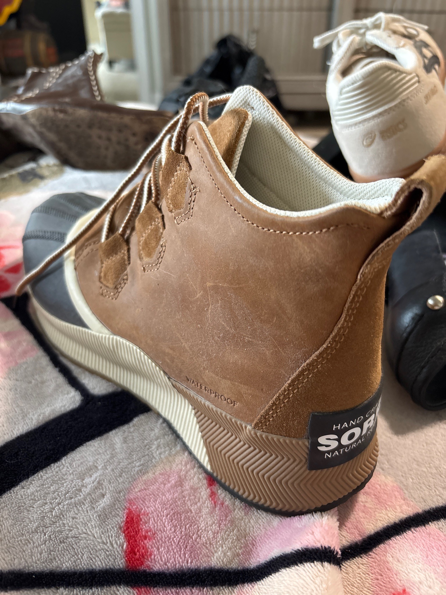 This is a pair of Sorel Out N About III hybrid sneaker-boots, designed for cold and wet weather. The upper is constructed from a combination of smooth, tan-colored waterproof full-grain leather and tonal suede accents on the heel counter and lace eyelet reinforcements. The boot features a distinctive 'duck boot' style rubber shell over the toe in a dark charcoal grey, integrated into a chunky, textured white and tan vulcanized rubber midsole with a herringbone traction pattern. The collar is lined with a breathable white textile mesh for comfort. Notable markings include a heat-embossed 'WATERPROOF' stamp on the lateral side of the leather and a prominent black rubber logo patch on the heel reading 'HAND CRAFTED SOREL NATURAL RUBBER.' The item shows signs of moderate use, including light surface scuffing and scratches on the leather panels, though the structural integrity appears sound. The stitching is tight and consistent, characteristic of modern Sorel manufacturing. This contemporary footwear blends utilitarians 'duck boot' aesthetics with a modern sneaker-like silhouette, suitable for fall and winter casual wear.