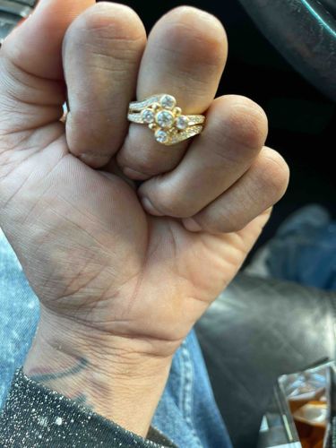 This is a contemporary-style jewelry piece, specifically a bypass or 'S-curve' cluster ring likely constructed from 10kt or 14kt yellow gold. The central focal point features a cluster of four round-cut stones (potentially diamonds or cubic zirconia) in bezel settings, arranged in a quadrant orientation. The band is designed with a split-shank bypass aesthetic, where the opposing sides of the band curve around the center cluster. Each side of the shank is intricately bead-set with smaller accent-round brilliant-cut melee stones, totaling approximately 10 to 14 accents visible. The construction appears to be cast/die-struck with a polished finish on the interior and edges. While no hallmarks are visible in the provided image, the design is characteristic of late 20th-century or early 2000s commercial fine jewelry. The condition appears fair, with visible surface micro-scratches on the gold metal and a slight dullness suggestive of either stone dirt accumulation or wear to the facet edges. There are no immediate signs of structural failure or missing stones, though a professional cleaning and prong/bezel check would be necessary to confirm the security of the stones and the exact metal purity.