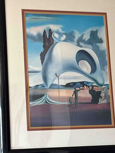 This item is a framed reproduction of Salvador Dalí's 1934 surrealist oil painting titled 'Atavistic Vestiges After the Rain'. The artwork features a biomorphic, calcified white form reminiscent of a giant skull or a melting structure, supported by a thin crutch—a recurring motif in Dalí's work. In the foreground, two small figures, typically identified as a father and child (often interpreted as Dalí and his father), stand in a desolate, dreamlike landscape under a dramatic sky with dark, towering clouds. The color palette consists of soft blues, earthy ochres, and deep purples in the shadows. The piece is professionally presented in a double mat—a crisp white outer mat and a thin brown inner reveal. It is housed in a contemporary black lacquer-style frame with protective glass. Notable condition issues include a prominent vertical reflection stripe and a curved glare on the glass surface indicative of photography through glazing, which makes it difficult to assess the paper's texture or the presence of a signature or edition number. The overall craftsmanship of the framing appears modern and intended for decorative home use rather than museum-grade preservation. Based on the framing style and presentation, this is likely a high-quality offset lithographic print from the late 20th or early 21st century.