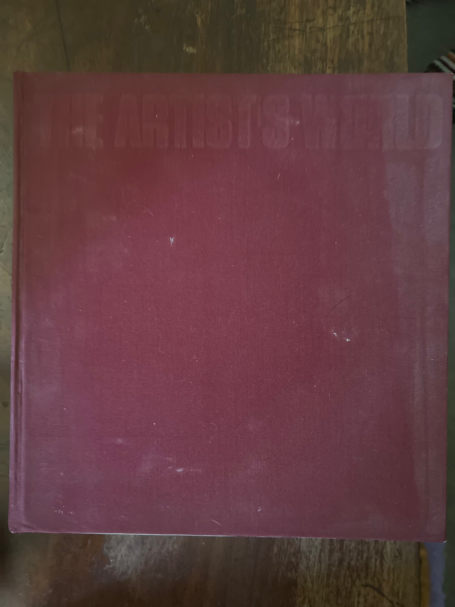 This item is a large-format, hardcover art book titled 'The Artist's World.' The volume is bound in a deep maroon or burgundy cloth with a textured, linen-like grain. The title is prominently blind-stamped or debossed across the top section of the front cover in a bold, sans-serif, heavyweight typeface. Physically, the book appears to be a square or nearly square coffee-table style monograph. The construction shows a standard sewn binding, visible along the left hinge. The maroon cloth covering exhibits several condition issues, including significant surface scuffing, minor white spotting (possibly mold spores, dust, or paint splatter), and a noticeable vertical line of wear or adhesive residue along the right edge, suggesting it may have been stored in a tight shelf environment or previously had a dust jacket that left a ghosting effect. The corners show slight softening/bumping consistent with use and age. There are visible hairline scratches and generic shelf wear on the fabric surface. Based on the typography and binding style, the item likely dates from the late mid-century period (circa 1960s-1970s). The lack of a dust jacket is a notable condition detraction, as these monographs were typically issued with high-gloss paper wraps featuring artwork. The craftsmanship is of a standard commercial quality for an art publication of that era.