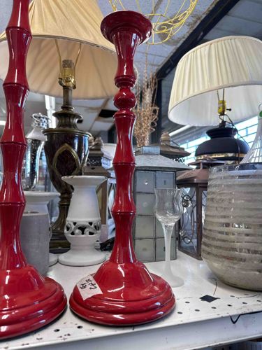 This is a pair of contemporary tall candlesticks featuring a distinctive Chinoiserie-inspired faux-bamboo design. Constructed from a heavy-weighted material, likely cast metal or resin, they are finished with a high-gloss cherry red lacquer that gives them a bold, modern aesthetic. Each stick stands approximately 14 to 16 inches tall and features several segments resembling bamboo stalks, separated by rounded nodes. The top terminates in a flared bobeche designed to hold standard taper candles, while the bottom transitions into a wide, stepped circular base for stability. The surface quality shows a high-shine reflective finish with some minor visible surface scratches and light wear consistent with secondary market display. While no specific maker's marks are visible in the photograph, the style is characteristic of late 20th to early 21st-century decorative home accents often found in boutiques like Pier 1 or West Elm. They appear to be in good used condition without major chipping to the red finish. Each base currently bears a handwritten price tag, suggesting they are being sold in a thrift or resale environment.