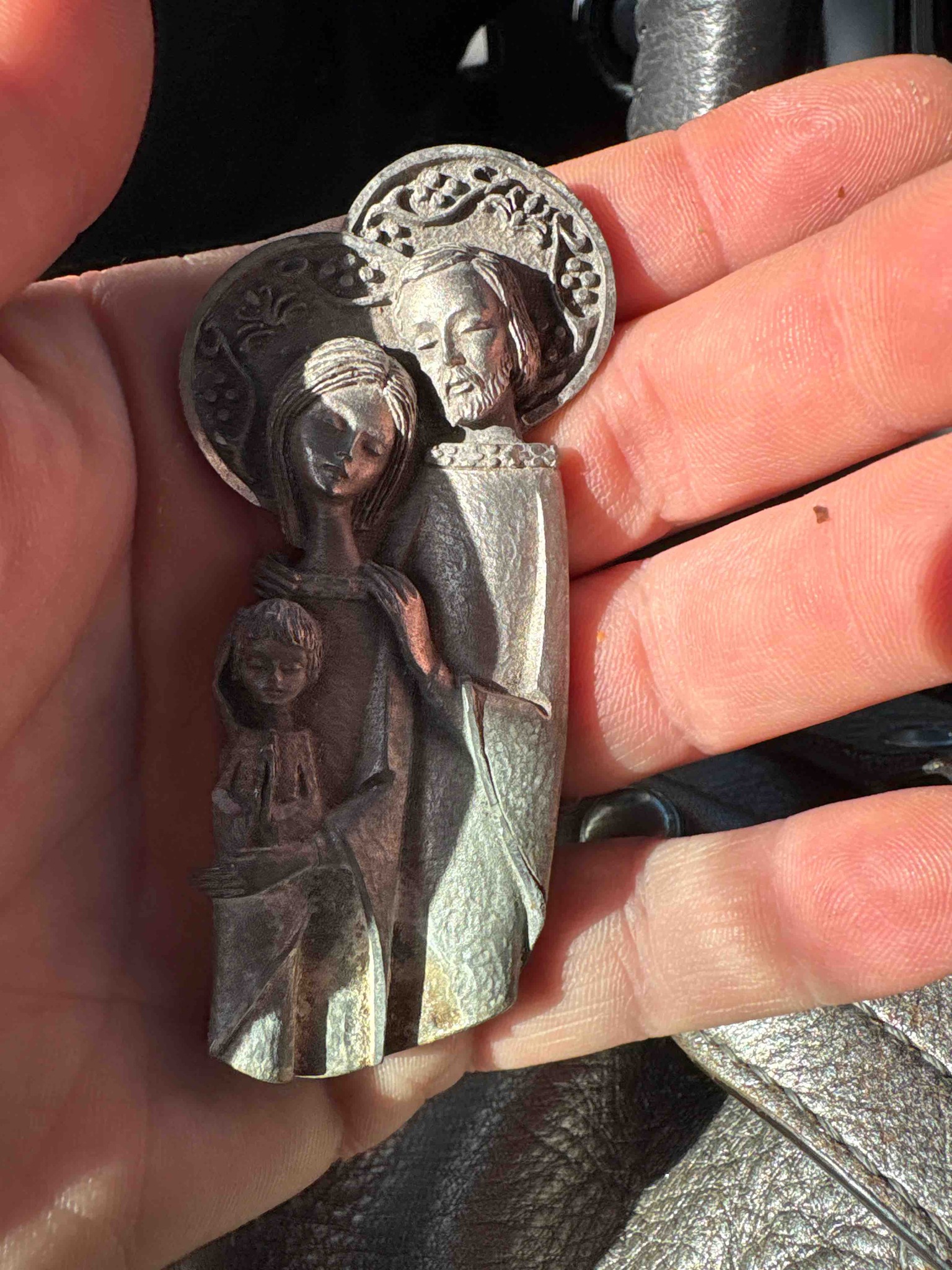 This item is a modernist-style figural plaque depicting the Holy Family (Joseph, Mary, and the Christ child), likely cast from pewter or a similar heavy lead-free base metal with a dull silver finish. It measures approximately 3 to 4 inches in height. The figures are rendered with elongated, stylized features typical of mid-20th-century religious art. Joseph stands protectively behind Mary, who holds a young Jesus; both adult figures feature large, circular halos with intricate open-work or filigree floral/foliage patterns which contrast against the smooth, minimalist drapery of their clothing. The surface exhibits a sand-cast or pebbled texture throughout the bodies of the figures. In terms of condition, the piece shows a matte grey patina and minor surface abrasions consistent with age and handling. There are no obvious maker's marks visible on the front, but the quality of the casting and the specific modernist aesthetic suggest it was produced between the 1960s and 1980s. The piece may have been intended as a wall hanging or a handheld devotional pocket icon, given its flat reverse and ergonomic size.