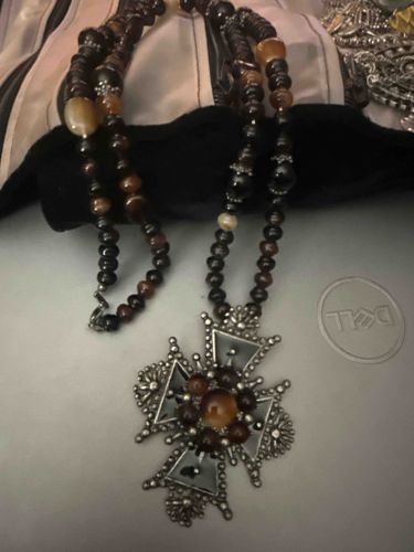 This is a statement-piece necklace featuring a large, ornate cross pendant with a Gothic-inspired aesthetic. The pendant is crafted from a silver-toned base metal, likely pewter or silver-plated alloy, featuring intricate filigree-style metalwork and bead accents that give it a highly textured, cast appearance. At the center of the cross is a large, polished cabochon in a honey-amber or tiger's eye hue, surrounded by smaller circular cabochons in deep chocolate brown. The necklace itself is composed of multiple strands of beads including dark cocoa-colored spherical beads, translucent amber-toned accent beads, and decorative silver-tone spacer beads. The construction utilizes a lobster claw clasp for closure. The overall style is reminiscent of costume jewelry from the late 20th century, possibly the 1980s or 1990s, mimicking a 'Renaissance Revival' or 'Bohemian' look. The metal shows minor oxidation and a dark patina in the recessed areas which is likely intentional to enhance the vintage feel. There are no visible maker's marks or stamps in the current view, but the craftsmanship suggests a high-quality fashion jewelry piece. The item appears to be in good pre-owned condition with no missing stones or broken links visible.