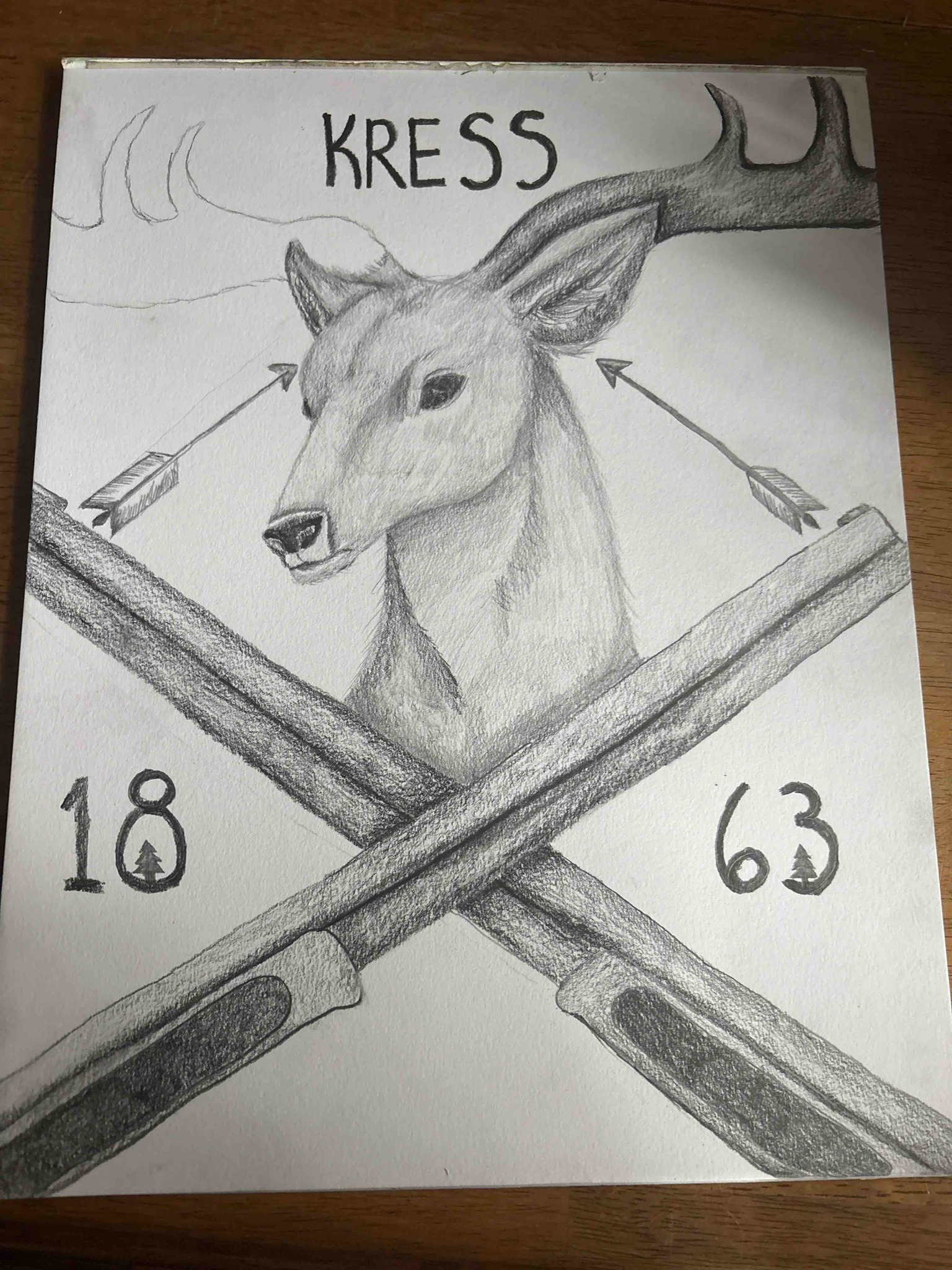 This is an original pencil drawing on white textured art paper, likely from a sketchbook or cold-pressed paper pad. The central motif features a three-quarter profile of a stag's head with stylized antlers. Below the deer are two crossed lever-action rifles, rendered with heavy charcoal or dark graphite shading. Flanking the deer's ears are two feathered arrows pointing upward. The top of the composition is emblazoned with the hand-lettered name 'KRESS' in a bold, sans-serif font. The lower portion features the numbers '18' and '63' on either side of the rifle stocks, with a small pine tree silhouette integrated into the loop of the number '8' and the '6'. The work is executed in a monochromatic grayscale palette using varying pencil grades for texture and shading. The drawing shows signs of contemporary folk-art influence with amateur-to-intermediate level craftsmanship. Condition-wise, the paper appears mostly clean with some minor smudging of the graphite in the background and soft buckling along the top edge near the binding line. No formal artist signature beyond the 'KRESS' text is visible. The style suggests a modern piece intended to mimic 19th-century hunting iconography or a personalized crest.