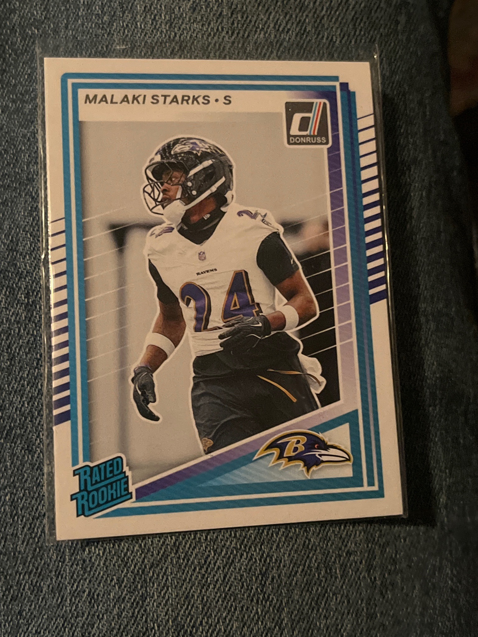 This is a modern sports trading card featuring defensive player Malaki Starks. The card is manufactured by Donruss, indicated by the 'D' logo in the upper right corner. It is part of the iconic 'Rated Rookie' subset, as noted by the teal and navy blue logo on the bottom left. The card follows a standard 2.5 by 3.5-inch rectangular format with white cardstock edges and a teal-lined border. The central image shows Starks in action wearing a Baltimore Ravens uniform with the number 24. The Ravens team logo is displayed in the bottom right corner. Physically, the card appears to be in excellent condition, housed within a clear protective plastic sleeve that prevents surface scratches. The corners appear sharp and the centering looks relatively balanced, though a formal grading would be required for confirmation. This item represents a 'base' rookie card, typical of the current era of sports collectibles (likely 2024 or 2025 based on the player's draft status). The high-gloss finish and crisp graphic design are characteristic of Panini/Donruss production standards. No visible structural damage, creasing, or edge wear is present in this view.