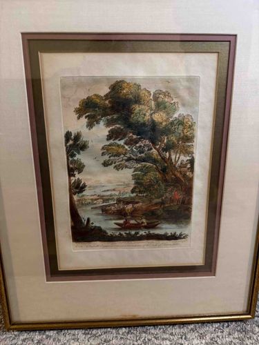 A professionally framed and matted hand-colored etching or engraving, likely an 18th or 19th-century reproduction of a Classical landscape painting by Claude Lorrain (Claude Gellée). The artwork depicts a pastoral scene featuring a body of water with three figures in a small rowboat in the foreground. Towering, artistically rendered deciduous trees dominate the right side of the composition, framed by a soft, atmospheric sky. In the middle ground, there are subtle hints of figures or cattle near the shore. The coloring is applied in soft washes of green, ochre, blue, and sienna, which is characteristic of the period's hand-tinting techniques. The plate mark is clearly visible, surrounding the central image, followed by a margin containing an engraved title and attribution text in cursive script. The piece is housed in an ornate gilded wood frame with a linen-textured mat and a secondary beaded or colored fillet accent. Regarding condition, there is a prominent brown tide line at the center bottom of the mat, indicating past moisture exposure. The paper shows moderate yellowing or 'toning' consistent with age, and a faint vertical crease or fold line is visible through the center of the image area. The craftsmanship of the engraving demonstrates fine stipple and line work, providing depth and texture to the foliage and water.