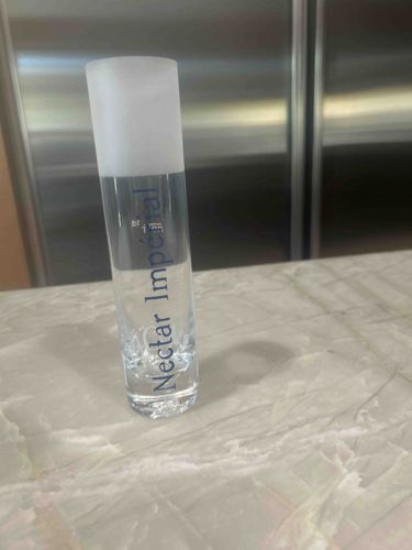 This item is a contemporary, tubular-style champagne flute branded for Moët & Chandon's 'Nectar Impérial' line. The vessel is constructed from clear, high-quality glass or lead-free crystal, featuring a distinctive cylindrical shape rather than a traditional tapered bowl. The top portion of the glass (approximately the upper third) features a frosted or acid-etched finish, providing a soft translucency that contrasts with the clarity of the lower body. The words 'Nectar Impérial' are printed vertically along the side in a deep navy blue or black serif typeface, accompanied by a small crest or crown logo indicative of the Moët brand heritage. The base is thick and weighted for stability, transitioning seamlessly into the body without a traditional stem. The overall aesthetic is modern and minimalist, likely produced as a promotional item or part of a luxury gift set within the last 10-15 years. The condition appears excellent with no visible chips, cracks, or fading of the printed typography, though there is a slight fingerprint smudge on the clear section. The craftsmanship is clean with no visible mold seams, indicating a high-end manufacturing process consistent with luxury champagne marketing materials.