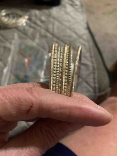 This item is a contemporary multi-strand cuff bracelet, designed to resemble a stack of several individual bangles joined or spiraled together. The piece is constructed from a silver-toned base metal, possibly stainless steel or silver-plated brass, given the bright, reflective finish. The bracelet features at least five distinct visible bands, each intricately textured with a knurled or beaded pattern that mimics small pavé settings or machine-tooled hatch marks. This texture provides a high-degree of light refraction, creating a sparkling effect. The design is a wrap-around style without a visible clasp, suggesting a flexible 'memory wire' or open-cuff tension-based construction. There are no visible maker's marks or hallmarks on the exterior surfaces shown. The condition appears to be used; while the structural integrity seems sound, there is visible dulling and potential surface wear consistent with contact friction. The overall aesthetic is representative of modern fashion jewelry from the late 20th to early 21st century, prioritizing bold visual impact and texture over precious metal weight.