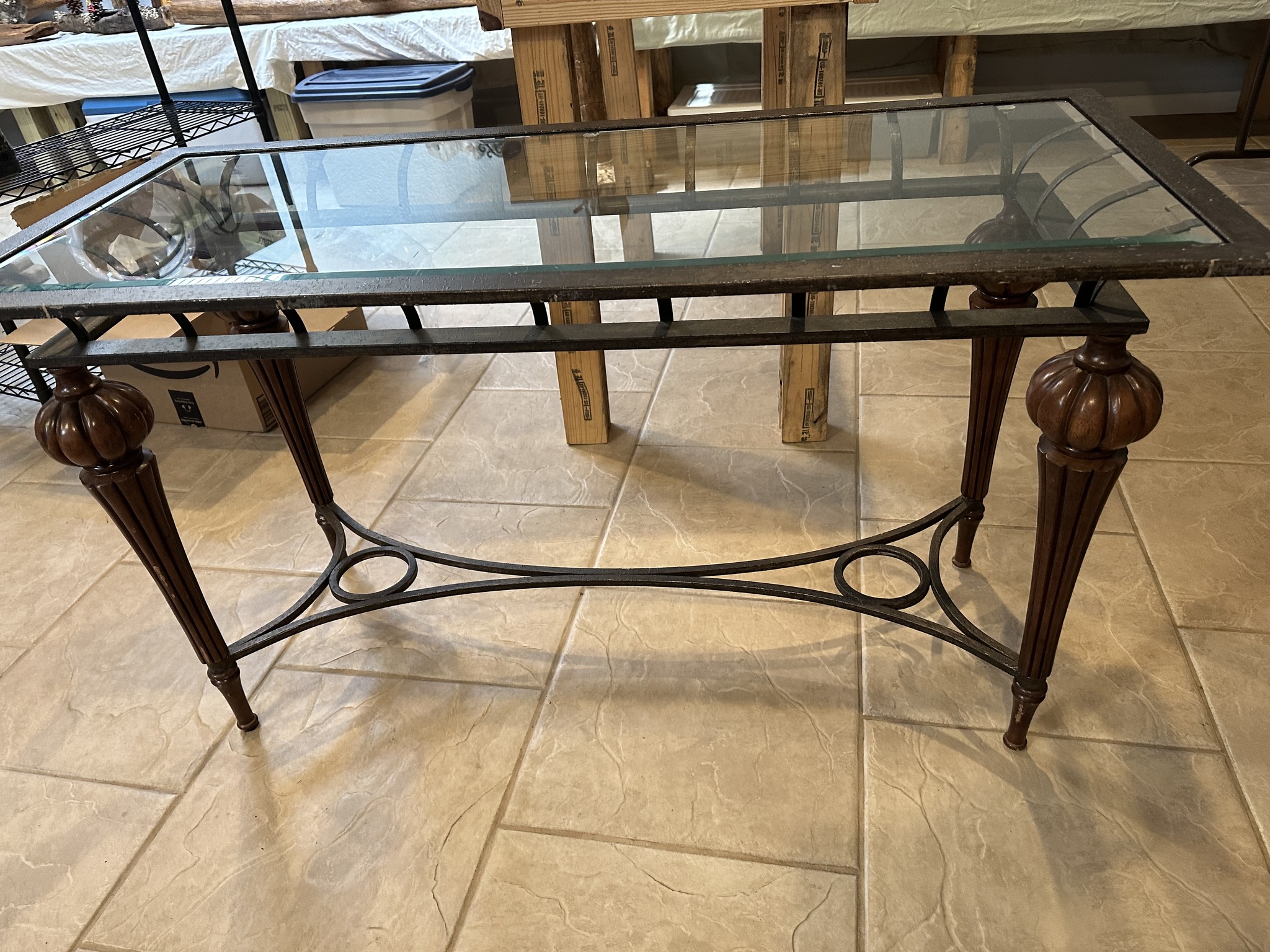This rectangular console or sofa table features a sophisticated mix of industrial and traditional materials. The top is composed of a clear, inset tempered glass pane held within a dark, wrought metal iron frame that shows a textured, aged bronze or blackened finish. The frame is further decorated with elegant metal scrolling and vertical bar supports beneath the perimeter. The table is supported by four distinctive hardwood legs, expertly carved in a neoclassical style. These legs feature a prominent, ribbed melon bulb at the top, tapering down to fluted columns and finishing in small rounded feet. A stabilizing decorative metal stretcher connects the legs, showcasing a graceful curved X-form with circular ring accents at the intersections. The dark walnut-toned wood legs contrast beautifully with the dark metalwork. The item appears to be of late 20th-century manufacture, drawing heavy inspiration from Mediterranean and regency design aesthetics. Notable condition details include minor surface scratches on the glass surface and slight scuffing or thinning of the finish on the lower portions of the wooden legs, consistent with moderate household use. No maker's marks are immediately visible, but the substantial joins and detailed carving suggest a high-quality furniture manufacturer for a boutique market.
