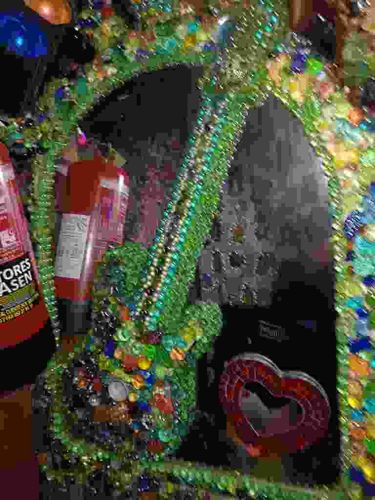 This unique piece of outsider art features a wall-mounted mirror heavily embellished with a mixed-media mosaic. The focal point is a stylized electric guitar shape applied directly to the mirror's surface, constructed from a dense collection of glass beads, marbles, and faceted synthetic gems. The color palette is dominated by vibrant lime and forest greens, punctuated by secondary accents of amber, cobalt blue, and clear elements. The neck of the guitar is defined by straight rows of beads, while the body is a chaotic yet deliberate arrangement of round and teardrop-shaped components. The mirror frame is equally adorned with a thick border of similar beaded materials. Notable features include a red heart-shaped secondary mirror or frame element in the lower right and various found objects integrated into the design. The construction appears to be a hand-applied adhesive method, characteristic of late 20th to early 21st-century folk or visionary art. Condition-wise, the piece appears structurally intact, though there is a layer of surface dust and the inherent fragility of the beadwork suggests potential for minor piece loss. The quality is defined by its maximalist aesthetic and time-intensive labor rather than refined fine-art techniques, making it a distinctive example of contemporary vernacular craft.