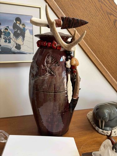 This is a large, hand-thrown ceramic vessel featuring a deep burgundy-brown crystalline or metallic glaze. The body of the jar is decorated with an incised, bas-relief depiction of a moose within a forest scene, exhibiting a rustic, naturalist style. The most striking element is the elaborate mixed-media topper and ornamentation. The lid is crowned with a large deer antler fragment that serves as a mount for a decorative knife featuring a carved bone handle and a knapped mahogany obsidian or flint blade secured with sinew-style wrapping. Below the rim, the vessel is adorned with a 'necklace' of large, polished red jasper or coral stones. Hanging from the side is a complex medicine-bag style tassel composed of a white carved bone feather, a small bone turtle fetish, polished stones, and a secondary smaller knife with a knapped blade. The craftsmanship suggests a contemporary studio potter, likely North American, working in a style that blends traditional stoneware with Indigenous-inspired or 'Old West' decorative motifs. The glaze shows high-quality depth and reflection. The overall condition appears excellent with no visible chips or cracks to the ceramic, and the organic components (antler, bone) appear well-preserved without desiccation. The complex assembly indicates a decorative/artistic function rather than a utilitarian one.