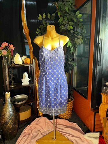 This is a vintage-style Chaudry cocktail dress, likely from the late 1990s or early 2000s, constructed from high-quality periwinkle-blue silk. This 'Shelli' model features a sleeveless, slim-fit silhouette with delicate spaghetti straps and a slight V-neckline. The garment is heavily embellished with an intricate, all-over lattice or trellis pattern formed by silver-toned glass beads and small sequins. At each intersection of the lattice, there are larger circular shell or mother-of-pearl style discs that provide a luminous, iridescent quality. The hemline is finished with a denser, ornate border of floral or starburst beadwork, creating a weighted and sophisticated hang. The craftsmanship is indicative of high-end boutique evening wear, focusing on hand-applied decorative elements. Based on the visual inspection, the dress appears to be in excellent used condition with no immediate signs of loose threads, missing beads, or staining, though vintage silk and beadwork are prone to snagging. The overall aesthetic combines Art Deco inspiration with millennium-era glamour.