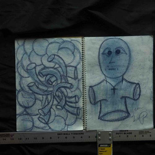 This is a two-page spread within a metal spiral-bound sketchbook featuring original artwork by Jean Larry. The left page displays an abstract composition of overlapping tubular forms and cloud-like spheres, rendered in monochromatic blue. The right page features a stylized humanoid torso and head, also in blue, donning a shirt marked with a central cross. The figure has distinct large eyes and a somewhat sculptural, simplified form. Both drawings are executed in what appears to be blue crayon or soft pastel on white or off-white paper. Notably, the right page bears the artist's signature 'Jean Larry' in the lower right corner. The sketchbook exhibits visible wear, including slight yellowing of the paper edges, minor creasing, and smudging inherent to the medium. The metal coil binding shows some oxidation consistent with age. Measuring approximately 12 inches in width when open, the work reflects a mid-to-late 20th-century naive or outsider art style, characterized by bold lines and symbolic imagery. The craftsmanship is expressive and fluid, indicating a focus on creative impulse over technical perfection.