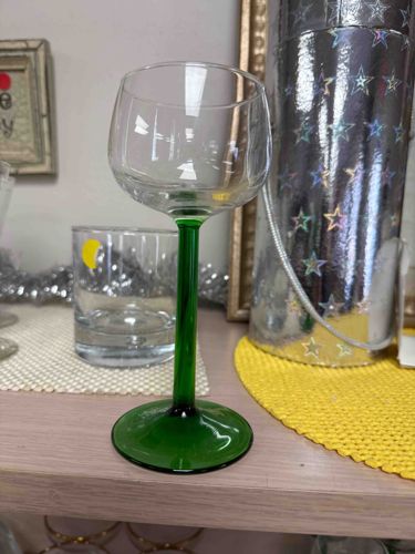 This piece is a classic Rhine wine glass, often referred to as a hock glass, characterized by its distinctive two-tone glass construction. The item features a clear, bowl-shaped vessel with a slightly incurved rim, designed to concentrate the bouquet of white wines. Supporting the clear bowl is a long, slender pulled stem and a circular foot, both crafted from a vibrant emerald-green translucent glass. This color contrast is a hallmark of traditional German and Alsatian glassware styles often produced in the mid-20th century. The glass appears to be machine-made or semi-automatic based on its uniform thickness and the smooth transition between the bowl and the colored stem. The stem shows a straight, unadorned profile, leading to a flat, stable base. In terms of condition, the glass exhibits high clarity in the bowl without visible clouding or calcification. There are no immediate signs of chips, cracks, or fleabites along the delicate rim or the edge of the foot. The green glass maintains a consistent, deep saturation. Lacking visible maker's marks or signatures in the image, this style is synonymous with manufacturers like Luminarc (France) or various Bavarian glassworks, likely dating from the 1960s to 1980s. The craftsmanship is clean, representing a quality mass-market vintage tableware item aimed at achieving an elegant, colorful aesthetic for formal dining.