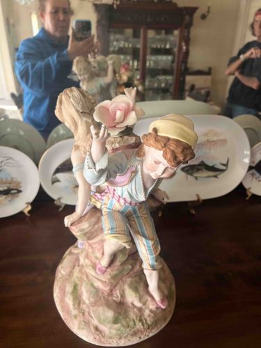This is an intricate figural porcelain sculpture, likely of Italian origin in the Capodimonte style, depicting a young boy and girl in pastoral or 'Napolitano' attire. The boy is prominently featured in the foreground, wearing a yellow hat, a light blue striped jacket with pink lapels, and multicolored striped breeches, while a girl sits behind him. At the center of the composition is a large, hand-formed pink porcelain rose. The figures are set upon a rustic, mound-like base with textured, rocky details painted in earthy pink and green tones. The color palette is composed of soft pastels including blues, yellows, and pinks, typical of the mid-20th-century Italian porcelain aesthetic. The craftsmanship displays delicate detailing in the finger work and the thin, translucent petals of the central flower. In terms of condition, there is a very significant and visible structural break at the back of the female figure's head/neck area, showing a jagged white porcelain fracture line that detracts from the value. There are also smaller chips visible on the edges of the rose petals and potential wear to the painted surface of the base. This piece likely dates from the mid-to-late 20th century and represents a classic example of decorative Italian bisque or matte-finished porcelain.