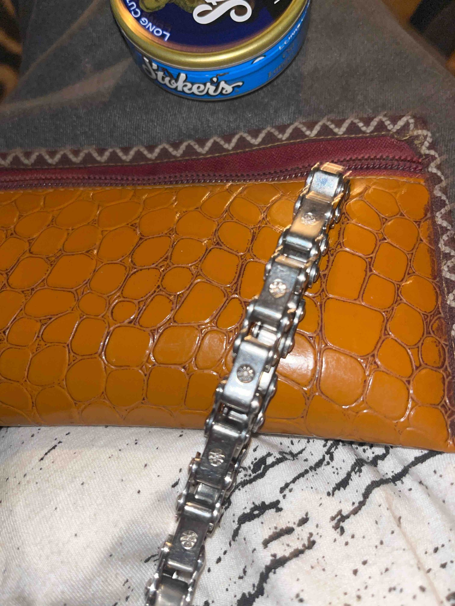 This item is a decorative men's bracelet designed to mimic the appearance of a heavy-duty motorcycle or bicycle drive chain. The piece is constructed from polished silver-toned metal, most likely 316L stainless steel given the high-luster finish and lack of visible tarnish. The bracelet features traditional roller link construction with alternating pin and link plates held together by visible rivets. A notable distinguishing feature is the presence of decorative circular insignias or crests embossed on the center of each outer plate, which adds a customized 'biker' aesthetic. The scale of the links suggests a substantial weight and width, typically measuring between 10mm to 15mm. The condition appears to be used but well-maintained, with minor surface micro-abrasions and light scuffing consistent with everyday wear. There is no evidence of structural deformation or broken pins. The craftsmanship is industrial and robust, reflecting a contemporary style popular in alternative fashion from the late 20th century to the present. The closure mechanism is likely a hidden fold-over clasp designed to blend into the links for a seamless appearance.