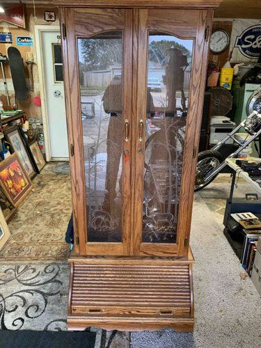Vintage Oak Two-Door Etched Glass Gun Cabinet with Tambour Base