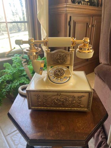 This is a decorative pedestal-style cradle telephone, likely a novelty or reproduction piece dating from the mid-to-late 20th century (c. 1960s-1980s). The unit features a cream-colored plastic or acrylic base and handset handle, accented with extensive gold-tone polished metal components. A primary distinguishing feature is the elaborate bas-relief metal paneling on the front of the square base and the vertical backboard. These panels depict a Rococo-style scene, frequently associated with Jean-Honoré Fragonard’s 'The Swing' or similar 'courting couple' motifs, rendered in a brass or bronze-finished metal with a slight dark patina in the recessed areas to enhance detail. The dialing mechanism is a classic rotary faceplate with gold-tone numbering and a central decorative medallion matching the bas-relief theme. The handset is a French cradle style, mounted horizontally on a dual-pronged brass rest, and is connected to the base by a white coiled plastic cord. The construction appears to be a mix of weighted plastic for the housing and plated metal for the hardware. Condition appears excellent with high-luster finish remaining on the metal parts and no visible cracking in the cream housing, though minor surface scratches and slight oxidation on the metal accents are typical for its age. While modeled after early 20th-century 'Eiffel Tower' or 'Cradle' telephones, the materials and cord style confirm it is a decorator piece designed for functional home use during the vintage revival era.