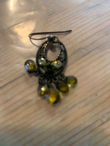 This item is a single chandelier-style dangle earring reflecting a bohemian or vintage aesthetic. The construction features an ornate, antiqued bronze-tone or oxidized silver-tone metal filigree frame with an oval-shaped open center. The metalwork is detailed with fine scroll patterns and beaded textures consistent with costume jewelry techniques. Embedded within the main frame are three small round-cut rhinestones in shades of olive and forest green. Suspended from the bottom of the central frame are five articulated, teardrop-shaped glass or acrylic beads in a translucent amber-green 'peridot' hue, which create movement when worn. The earring is suspended from a standard 'fish hook' style ear wire of matching dark metal. While no hallmarks are visible in the image, the finish suggests a piece from the late 20th century or a modern reproduction of Victorian/Art Nouveau styles. Condition appears fair to good with a natural-looking patina; however, the focal point shows possible minor surface accumulation and slight dulling of the stones. The overall craftsmanship is mid-tier decorative, designed for aesthetic appeal rather than high-value precious metal content.