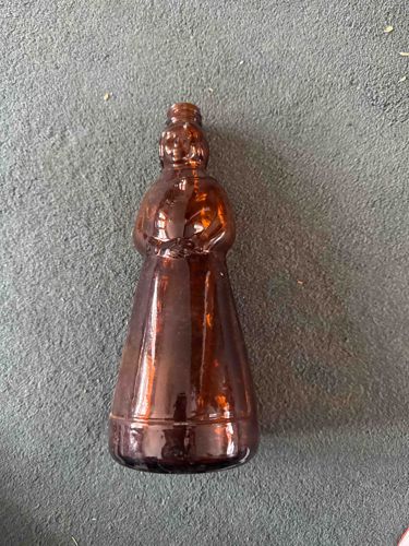This item is a vintage glass bottle, molded in the shape of a rotund woman, commonly recognized as the 'Aunt Jemima' character. The bottle is crafted from dark amber or brown colored glass, giving it a somewhat translucent quality when light passes through. It features a figural design, with the upper portion depicting the head, shoulders, and arms of a woman, while the lower portion forms a conical, skirt-like base for stability. The woman's features are somewhat stylized, with a round face, discernible eyes, nose, and mouth, and what appears to be a headscarf or bun. Her hands are depicted clasped together at the front, possibly holding an object, though it is not clearly defined. The neck of the bottle is short and narrow, ending in a threaded or lip finish that would have originally accommodated a cap or pour spout. The overall construction suggests it was manufactured through a molding process, indicated by the visible seams that would run along its sides (though not explicitly clear in the provided image). The glass appears to be in good condition, with a shiny surface reflecting light, suggesting minimal scratches or hazing. No significant chips, cracks, or repairs are immediately visible. The style strongly points to a mid-20th century production, likely between the 1950s and 1970s, as similar figural syrup bottles were popular during this period. The 'Aunt Jemima' character was a well-known advertising icon for pancake mix and syrup, making this a recognizable and collectible piece of Americana and advertising memorabilia.