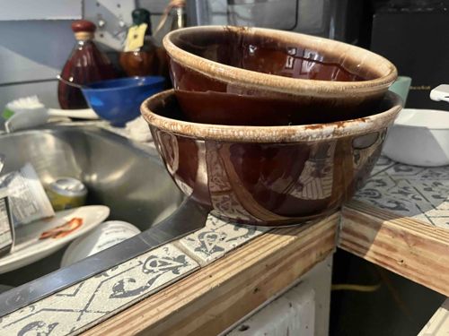 This pair of nested ceramic bowls features the iconic 'Brown Drip' glaze, a quintessential aesthetic of Mid-Century American pottery. The bowls are characterized by a deep, high-gloss chocolate brown body that transitions into a creamy, foamy tan or oatmeal-colored rim. This effect was achieved through a reactive glazing process where the lighter glaze drips down over the dark base during firing. Based on the silhouette and glaze pattern, these are likely produced by Hull Pottery or a similar manufacturer like McCoy or Pfaltzgraff, dating from the late 1960s to the 1970s. The bowls are thick-walled stoneware, designed for durability and kitchen utility. The larger bottom bowl and smaller top bowl show a rounded profile with a gentle taper toward the base. Regarding condition, the glaze retains a high luster, but there are visible signs of wear consistent with age and use. Small chips are evident along the rims where the lighter glaze meets the brown, particularly on the lower bowl, and minor surface scratches or 'utensil marks' are likely present upon closer inspection. No major cracks or structural repairs are visible in the current view. The craftsmanship reflects mass-produced but high-quality kiln-fired stoneware from the American industrial pottery era.