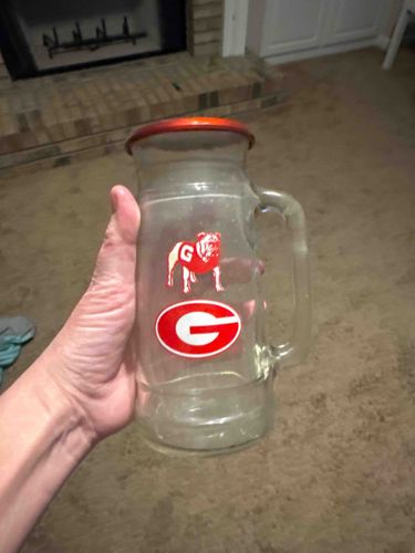 This item is a clear glass beverage stein or mug featuring the collegiate branding of the University of Georgia (UGA). The vessel is constructed from thick, molded glass with a sturdy, integrated C-shaped side handle. The primary decorative elements are applied screen-printed decals on the front surface. These includes the iconic 'Uga' bulldog mascot wearing a red jersey with a white 'G', positioned above a red-and-white oval 'G' logo. The glassware features a slightly tapered cylindrical body with decorative horizontal ridges molded into the glass near the top and bottom. A notable feature is the orange-toned metallic lid or coaster resting on the rim, which suggests it may be part of a set or designed for temperature retention. Structurally, the glass appears to be in good utilitarian condition without visible chips or major cracks, though the surface shows light scuffing and cloudiness indicative of regular use and age. The decals remain vibrant and mostly intact, showing minimal peeling. This type of collegiate memorabilia reached peak popularity in the late 20th century, likely dating from the 1980s to the 2000s. The craftsmanship is standard for mass-produced promotional glassware, prioritizing durability and brand recognition over fine artisanal detail.