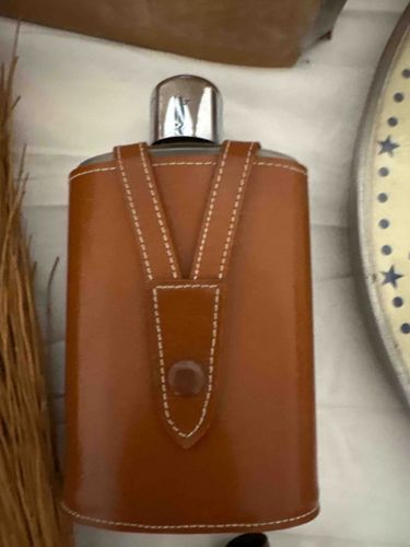 This item is a contemporary stainless steel hip flask featuring a distinctive decorative leather wrap. The flask body is constructed from polished stainless steel, visible at the rounded shoulders and the threaded screw-top cap. The most prominent feature is the cognac-colored (tan-brown) faux or genuine leather sleeve that encompasses the majority of the vessel. This sleeve is uniquely styled with integrated straps forming a 'V' shape on the front, secured by a central snap button, mimicking the aesthetic of vintage sporting gear or suspenders. The leather work features prominent contrast white top-stitching along all edges, which serves as both a structural and decorative element. The flask has a traditional gently curved rectangular profile, designed for ergonomic pocket carry. Condition appears to be excellent or 'as new,' with no visible scuffs to the leather surface, no tarnishing on the metal, and tight, uniform stitching throughout. There are no visible maker's marks or logos on the front face, suggesting a mass-produced modern giftware piece likely manufactured in the late 20th or early 21st century. The craftsmanship is clean and commercial, aimed at the lifestyle or barware market.