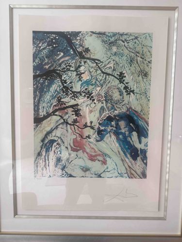 This item is a limited edition color lithograph by the renowned Surrealist artist Salvador Dalí, titled 'Tityrus and Meliboeus' from his 1970 suite 'Les Eglogues de Virgile' (The Eclogues of Virgil). The artwork features fluid, ethereal linework and a palette composed of soft greens, blues, muted ochres, and hints of red, depicting classical figures in a pastoral landscape through a surrealist lens. The composition is framed by dark, skeletal tree branches that provide a sharp contrast to the lighter watercolor-style background. Physically, the piece is printed on high-quality woven paper with wide margins. It features a visible signature in pencil in the lower right and an edition number (likely out of 250 or 150) appearing on the lower left. The framing consists of a modern, thin silver-toned metallic or wooden frame with a custom white matting that creates a floating effect for the paper. The condition appears stable, with no visible foxing, tearing, or significant fading, though slight rippling of the paper is evident within the frame—a common occurrence for original prints. This work represents Dalí's mid-century mastery of the lithographic medium and his fascination with classical literature, specifically the works of the Roman poet Virgil.