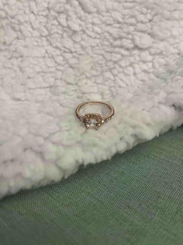 This item is a contemporary fashion ring featuring a rose gold-colored metal finish, likely a plated base metal or rose gold-toned sterling silver. The ring features a central round-cut clear stone, which based on visual observation is most likely a cubic zirconia or a lab-created crystal. This center stone is secured by a four-prong setting and is surrounded by a halo of smaller, pave-set clear stones that enhance its brilliance. The band itself is thin and delicate, featuring additional small accent stones embedded along the shoulders, reflecting a modern 'petite' style. The construction shows a standard commercial casting with a polished finish. The condition appears to be good with no obvious signs of missing stones or significant metal deformation, though fine surface scuffing characteristic of light wear is present. There are no clearly visible maker's marks or metal stamps in this view. This style is consistent with high-street fashion jewelry from the last ten years, specifically the 'rose gold' trend popular in mid-market bridal and accessory design. The craftsmanship is typical for mass-produced fashion jewelry, prioritizing visual sparkle and aesthetic appeal for casual or decorative wear over high-value investment materials.