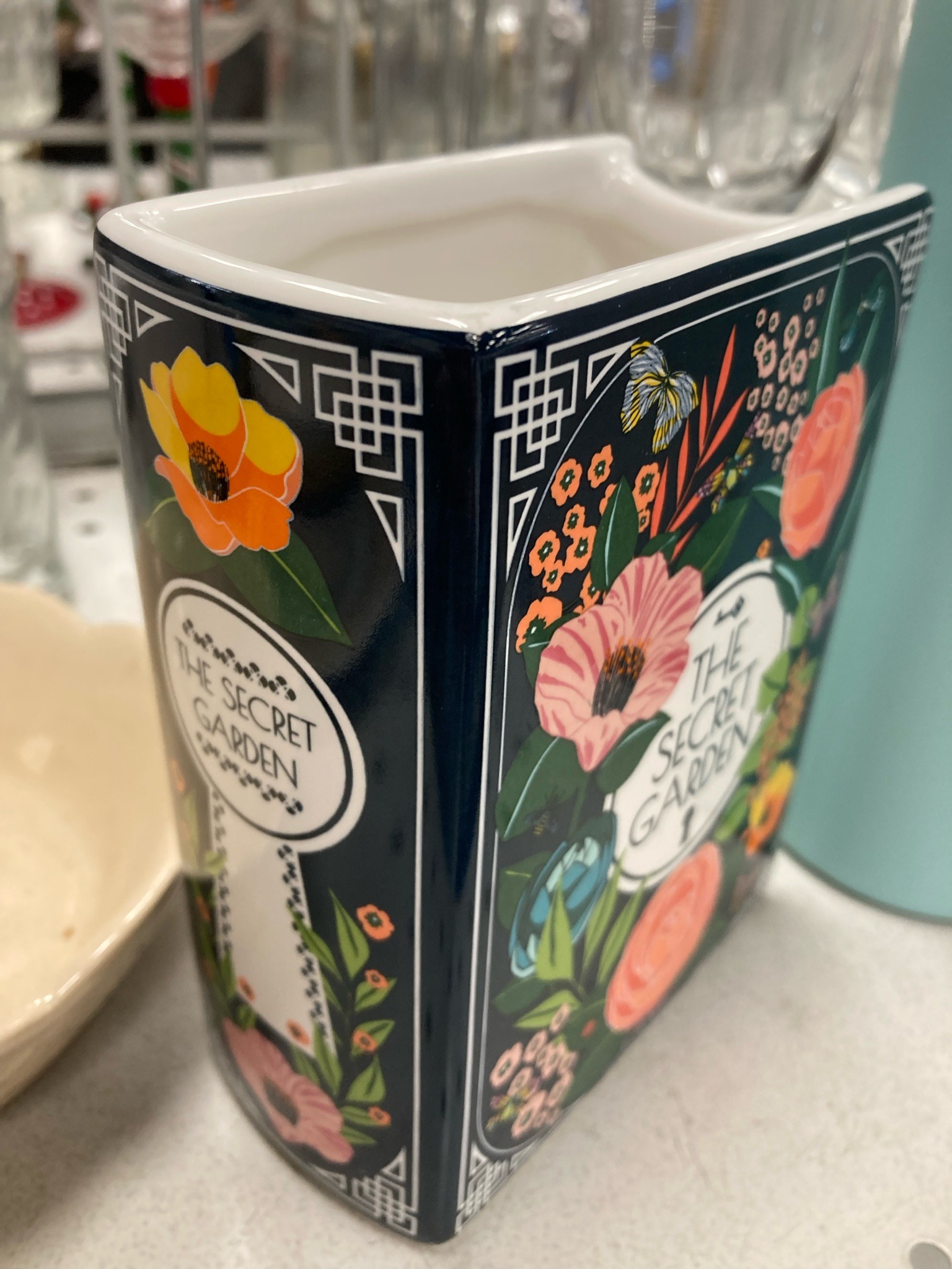This item is a decorative ceramic vase or utensil holder designed in the shape of a hardcover book, featuring artwork inspired by Frances Hodgson Burnett's literary classic 'The Secret Garden'. Constructed from white-bodied earthenware or porcelain, the piece is rectangular with a hollow interior and a top opening, mimicking the pages of a book. The exterior faces are finished with a high-gloss midnight blue or black glaze, serving as a background for vibrant multi-colored floral transfers. The design includes pink roses, orange blossoms, and a detailed butterfly, bordered by white geometric fretwork at the corners that resembles Art Deco or vintage book binding motifs. The 'spine' and 'cover' prominently feature the title 'The Secret Garden' in a decorative serif font within white oval medallions. In terms of condition, the piece appears to be in good contemporary condition with no visible cracks, though a small speck of glaze wear or a manufacturing imperfection is visible on the top rim corner. The craftsmanship indicates a mass-market giftware production from the late 20th to early 21st century, likely produced for a boutique brand like Smithsonian (SM @ Co) or similar literary-themed decor lines. The internal glaze is a clean white, and the flat base allows for stable display on a shelf or desk.