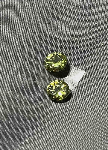 This item consists of a pair of loose, faceted gemstones, identified by their characteristic olive-green hue as peridots. The stones are round brilliant cuts, designed to maximize light return and sparkle. Each stone appears to be of moderate size, likely between 1 to 2 carats based on visual proportions against the background fabric texture. The color is a vibrant yellowish-green, consistent with high-quality olivine mineral specimens. The faceting shows a standard symmetrical pattern including a table, crown facets, and a pavilion. Upon close inspection, the stones exhibit high clarity with no major eye-visible inclusions, though microscopic internal 'lily pad' inclusions typical of peridot may be present. The surfaces appear polished with sharp facet junctions, suggesting a modern precision cut. There are no obvious chips, abrasions, or scratches visible on the crowns. The stones are currently held against a grey textured fabric with a small piece of clear adhesive tape, indicating they are unset and ready for jewelry mounting. They appear well-matched in color and size, making them ideal for a pair of stud earrings or side stones in a three-stone ring setting.