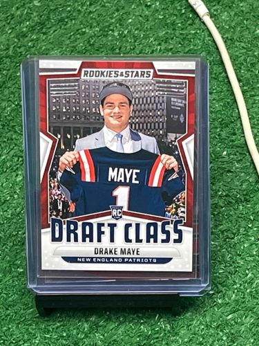 This is a modern sports trading card featuring Drake Maye, the New England Patriots quarterback. The card is part of the 'Draft Class' subset within the 'Rookies & Stars' series by Panini. The card displays a high-resolution image of Maye holding his New England Patriots jersey against a cityscape background. The design features a patriotic color palette of red, white, and navy blue, with a prominent 'RC' (Rookie Card) shield logo centered above the player's name. The card is standard size (approximately 2.5 by 3.5 inches) and constructed from multi-layered cardstock with a glossy finish. It is currently housed in a protective plastic top-loader, which helps preserve its condition. The craftsmanship highlights modern printing techniques with sharp graphics and clean typography. No visible surface scratches, corner softening, or edge wear are apparent through the protector, suggesting a high-grade condition. This specific item represents a significant collectible for football fans and investors, produced in the 2024 manufacturing year.