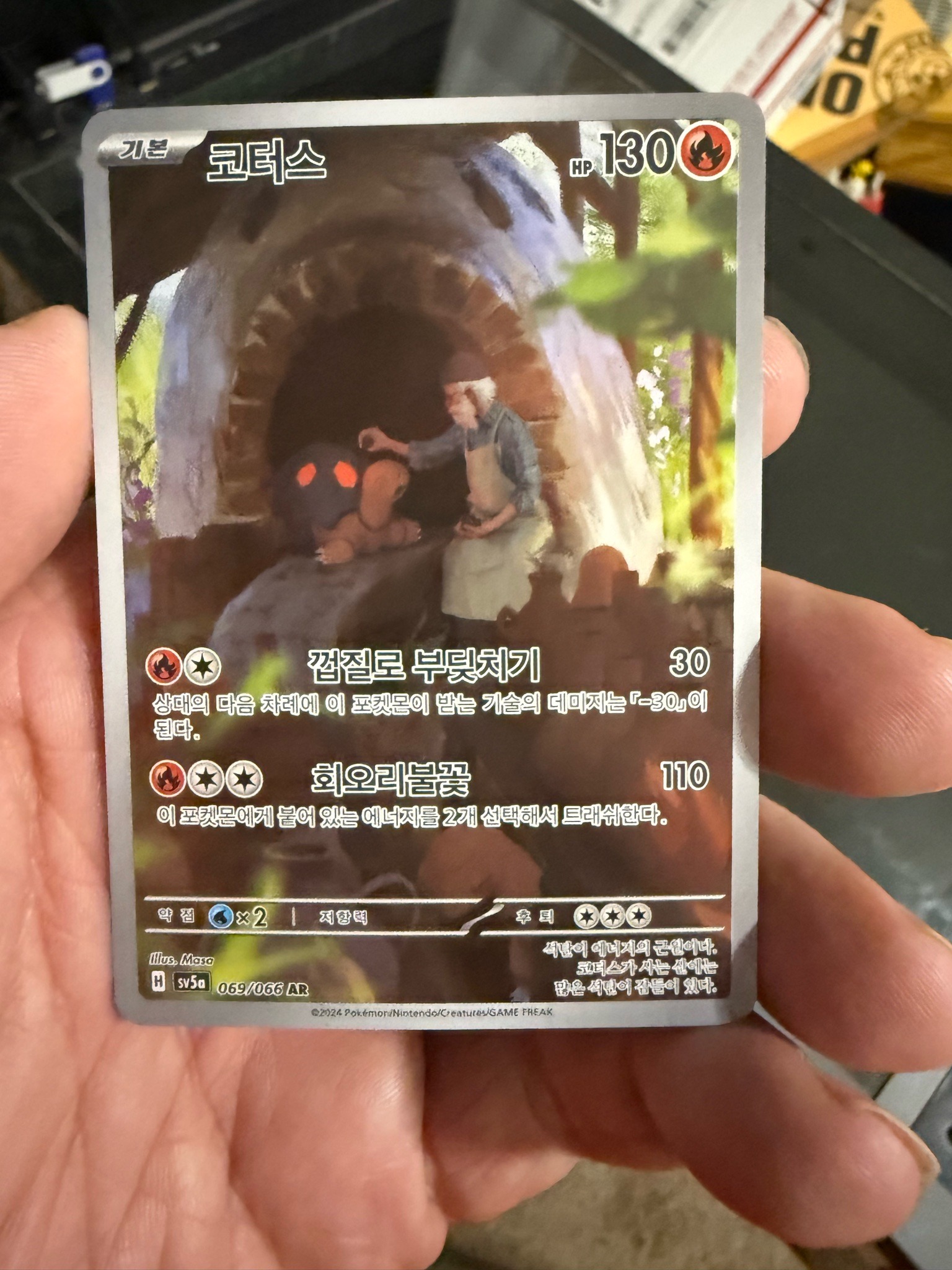 This is an authentic Korean-language Pokémon Trading Card featuring the Pokémon Torkoal. The card is an 'Illustration Rare' (AR) from the Crimson Haze (sv5a) expansion, released in 2024. The artwork, credited to the illustrator Masa, displays a full-art painterly scene depicting a Torkoal assisting an elderly blacksmith or potter inside a traditional stone kiln. Physically, the card features standard TCG dimensions (approx. 63x88mm) with a silver holofoil border. It maintains a distinct light-refractive quality characteristic of modern Art Rare cards. Notable markings include the set code 'sv5a' and the collector number '069/066 AR' in the bottom left corner, alongside the 2024 Nintendo/Creatures/GAME FREAK copyright. The card text is entirely in Korean, detailing the Pokémon's name (코터스), its HP (130), and its specific attacks. The card appears to be in 'Near Mint' condition with sharp corners, clean edges, and no visible surface scratches or whitening on the front side. The craftsmanship is high, typical of modern Pokémon Card Game production standards, featuring crisp offset printing and intricate foiling effects throughout the illustration area.