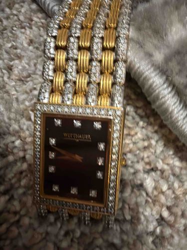 This is a vintage Wittnauer men's or unisex rectangular dress watch featuring a distinctive two-tone aesthetic. The timepiece is characterized by a rectangular case accented with a diamond-set bezel. The watch face is a dark, possibly chocolate brown or black obsidian-style dial, featuring twelve small diamond hour markers and gold-tone dauphine hands. The 'Wittnauer' brand name is clearly visible below the 12 o'clock position. The most striking element is the integrated five-link bracelet, which alternates between gold-tone fluted links and silver-tone links encrusted with pav-set decorative crystals or small diamonds. The construction suggests a late 20th-century style, likely from the 1980s or 1990s, when ornate, jewelry-focused timepieces were prevalent. The item shows signs of light wear consistent with age, including minor surface scratches on the metal and potential plating thinning on the higher-contact areas of the gold-tone links. The overall craftsmanship displays high-quality decorative finishing intended for formal or evening wear. No visible cracks are present on the crystal, and the crown remains intact on the right side of the case.