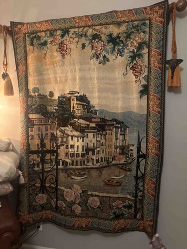 This item is a decorative Jacquard-woven wall tapestry depicting a picturesque Mediterranean harbor scene, likely inspired by the Lake Como region of Italy. The composition features a foreground bordered by a black wrought-iron gate and pink roses, leading the eye into a tranquil bay filled with small rowboats. The midground showcases a cluster of multi-story terracotta and cream-colored buildings cascading down a hillside. The scene is topped with a canopy of hanging grapevines and fruit clusters. The piece is finished with an ornate acanthus leaf border in shades of copper, gold, and teal. It is constructed from a blend of cotton and synthetic fibers, typical of late 20th-century decorative textiles. The tapestry is displayed on a wooden rod with decorative finials and oversized gold-toned tassels hanging on either end. The overall weave appears tight with a slightly lustrous finish in the sky area, indicating the use of rayon or polyester strands. Condition appears excellent with no visible fraying, fading, or staining, suggesting it has been kept in a climate-controlled environment away from direct sunlight. The style is contemporary traditional, dating from approximately 1990-2010.