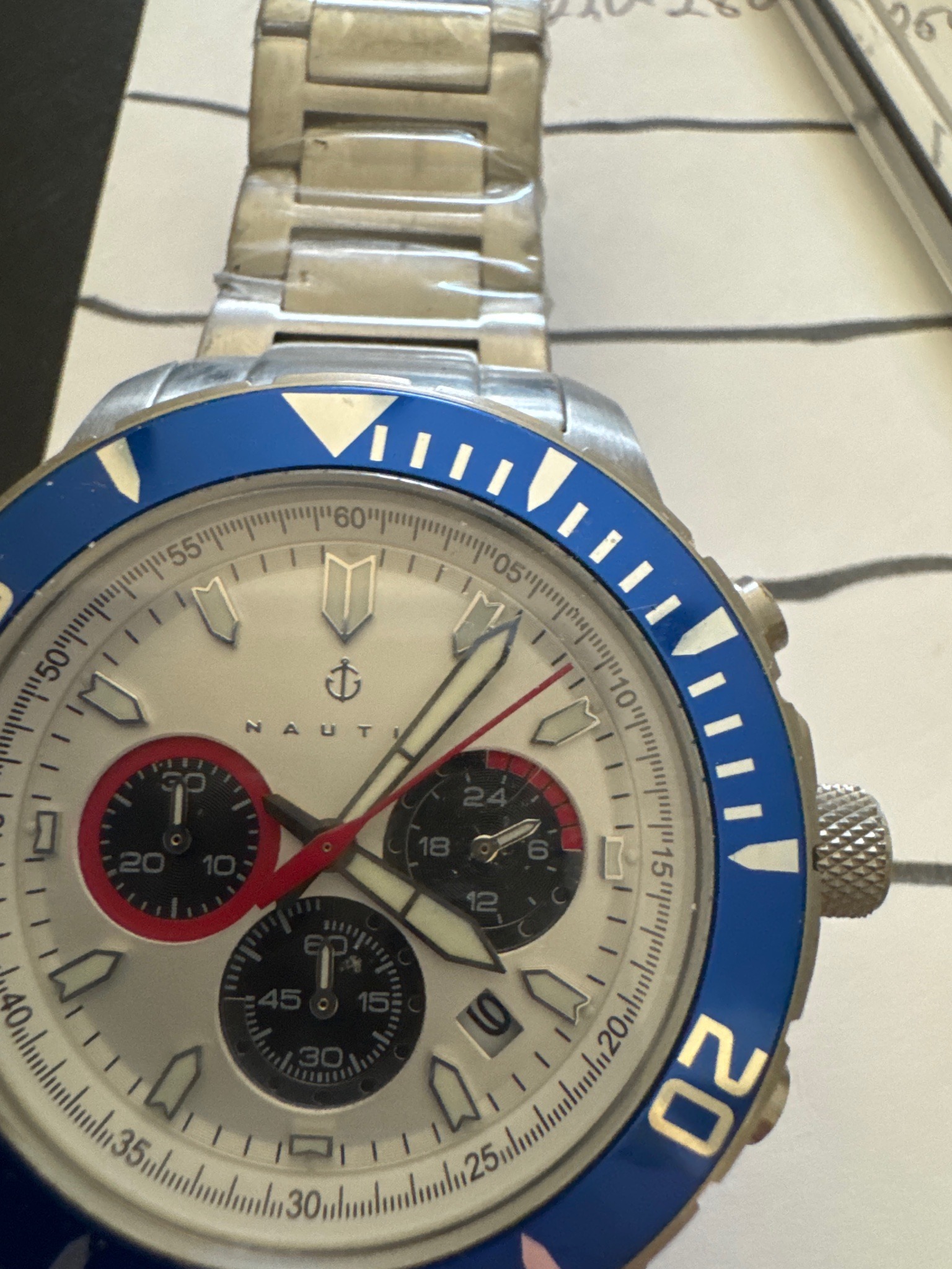 This is a modern Nautica chronograph wristwatch featuring a brushed and polished stainless steel case and a matching link bracelet. The watch design is inspired by nautical diving aesthetics, characterized by a vibrant blue unidirectional rotating bezel with a silver-tone 60-minute scale and an inverted triangle marker at the 12 o'clock position. The dial is silver-toned with a sunray or matte finish, accented by three black sub-dials (chronograph functions and a 24-hour indicator) located at the 3, 6, and 9 o'clock positions. Notable features include wide, luminescent syringe-style hands, a prominent red chronograph seconds hand, and applied shield-shaped hour markers. A date window is visible between the 4 and 5 o'clock positions. The Nautica logo, featuring their signature J-class sail/anchor emblem, is placed below the 12 o'clock index. The case features a large, textured screw-down crown and classic pump-style pushers for the stopwatch functions. The condition appears to be new or very lightly used, as evidenced by the protective plastic film still covering the stainless steel bracelet links, indicating it has likely not been worn for extended periods. The craftsmanship is typical of a mid-range consumer fashion watch, emphasizing rugged nautical styling and functional durability for casual wear.