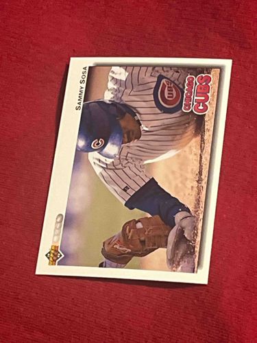 This is a 1994 Upper Deck baseball card featuring Sammy Sosa of the Chicago Cubs. The card is printed on standard semi-glossy cardstock with a horizontal orientation. The front features a high-action color photograph of Sosa wearing a white and blue pinstriped Chicago Cubs home jersey with a blue helmet and batting glove, sliding into a base. The Upper Deck hologram logo is visible in the bottom left corner. The player's name, 'SAMMY SOSA', is printed vertically along the left edge in black serif font, and a stylized 'CHICAGO CUBS' logo is placed in the upper right. The card features a white border. Regarding condition, the card appears generally well-preserved with sharp corners and clean edges, though the centering appears slightly shifted toward the bottom and left. There are no obvious surface creases or major paper loss visible in the image. This piece from the mid-1990s represents the height of the hobby's 'junk wax' era, produced by Upper Deck, a company known for introducing premium printing quality to the industry. The craftsmanship reflects the era's transition toward high-definition photography and UV coating.