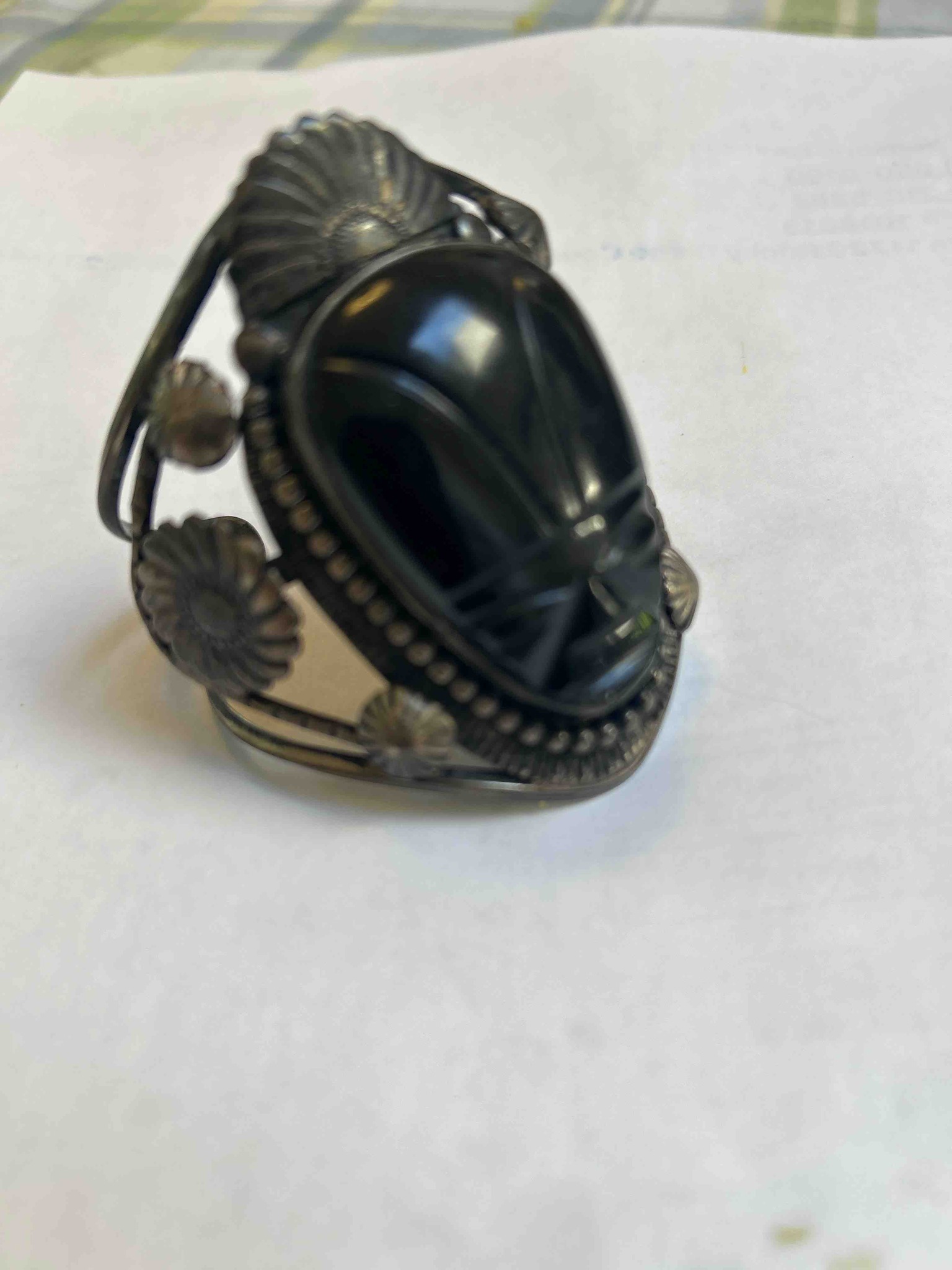 Vintage Taxco Mexican Sterling Silver and Carved Onyx Mask Cuff Bracelet