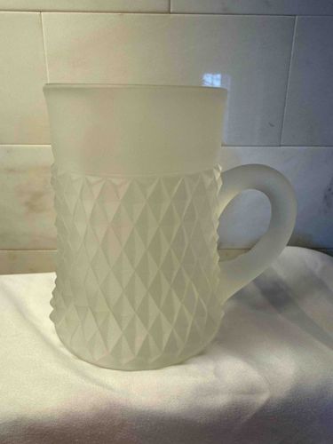 This is a vintage or mid-century decorative mug crafted from frosted or 'Satin' glass. The piece is characterized by a translucent, matte white finish that diffuses light, giving it a soft, velvety texture. The lower two-thirds of the mug's body features a raised, pressed glass pattern known as 'Diamond Point' or 'English Hobnail,' consisting of numerous three-dimensional, sharp-peaked diamond facets that provide both visual interest and a tactile grip. The upper third of the mug is smooth and cylindrical, leading to a simple, unadorned rim. A sturdy, thick, C-shaped handle is attached to the side, maintaining the same frosted satin finish as the body. This style of glassware was popular in the mid-20th century, frequently produced by American glass companies such as Fenton, Westmoreland, or Imperial. The construction appears seamless, indicating quality mold-blown or pressed glass techniques. The condition appears excellent with no visible chips, cracks, or discoloration, though the matte surface may show faint fingerprints or oils from handling. The uniform frosting suggests an acid-etched or sandblasted treatment applied after the primary molding process.