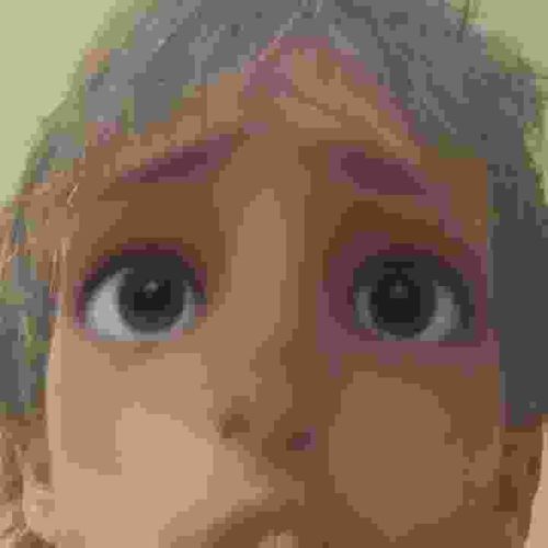 This is a digital illustration featuring a close-up, cropped view of a stylized human character's face, focusing specifically on the eyes and brow area. The art style exhibits qualities characteristic of modern 3D animation or digital character design, marked by large, expressive dark eyes with distinct highlights, arched purple-hued eyebrows, and soft skin tones including shades of peach, tan, and brown. The image suffers from significant digital artifacts and heavy pixelation/compression, which obscures sharp details and creates a blocky, layered color effect across the facial features. The 'materials' are digital pixels, and the construction is a rasterized image format. There are no visible maker's marks or signatures due to the tight cropping. The contemporary style suggests it was created within the last 10-15 years, likely as a fan-art piece or an animation still. Despite the low resolution, the character's expression conveys a sense of wonder or apprehension, emphasizing the pupils' reflective details.