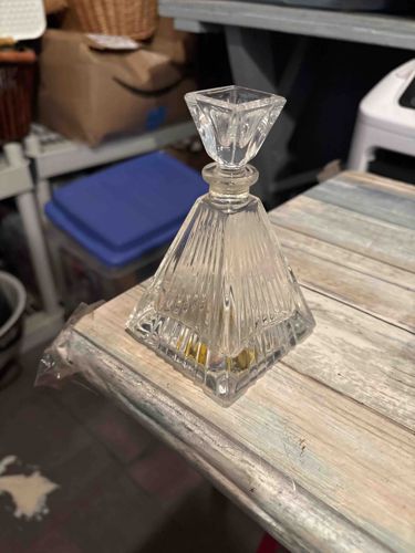 This item is a clear glass perfume bottle featuring a distinct four-sided pyramidal base and a matching geometric stopper. The body is characterized by vertical ribbing or fluting that tapers toward the neck, giving it a strong Art Deco aesthetic. The stopper is shaped like an inverted hollow pyramid with a square top, fitting into a short, circular neck. Based on its clarity and the visible mold lines along the edges, it appears to be pressed glass rather than hand-cut crystal. Standing approximately 4 to 5 inches tall, the bottle showcases a thick square base for stability. In terms of condition, there is visible clouding or residue inside the vessel, suggesting it was previously used and not thoroughly cleaned. While no large chips are immediately apparent, there is typical flea-bite wear around the sharp geometric edges and the base. The style suggests mid-20th-century mass production, likely dating from the 1940s to the 1960s, a period when geometric vanity sets were highly popular. No specific maker's marks are visible, though it is characteristic of commercial glass manufacturers of that era.