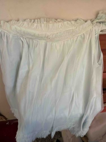 This garment is a pale mint green or ice blue off-the-shoulder blouse, likely constructed from a lightweight synthetic blend or semi-sheer cotton voile. The primary design feature is a wide, horizontally smocked elasticated neckline that allows for versatile positioning on the shoulders. Above and below this smocked band are delicate, small-scale ruffles, creating a feminine 'lettuce-edge' texture. The body of the shirt is loose and voluminous, featuring vertical gather lines that originate from the elasticated top. The fabric appears thin and susceptible to wrinkling, as evidenced by the significant creasing throughout the lower half. Construction details include basic serged or rolled hems at the ruffles. While no brand tags are visible in the photo, the style is contemporary, reminiscent of late 2010s to early 2020s fast-fashion trends. The condition appears fair, with heavy wrinkling suggesting standard machine washing and storage without pressing. There are no immediate signs of tearing, though the lightness of the fabric makes it prone to snagging.